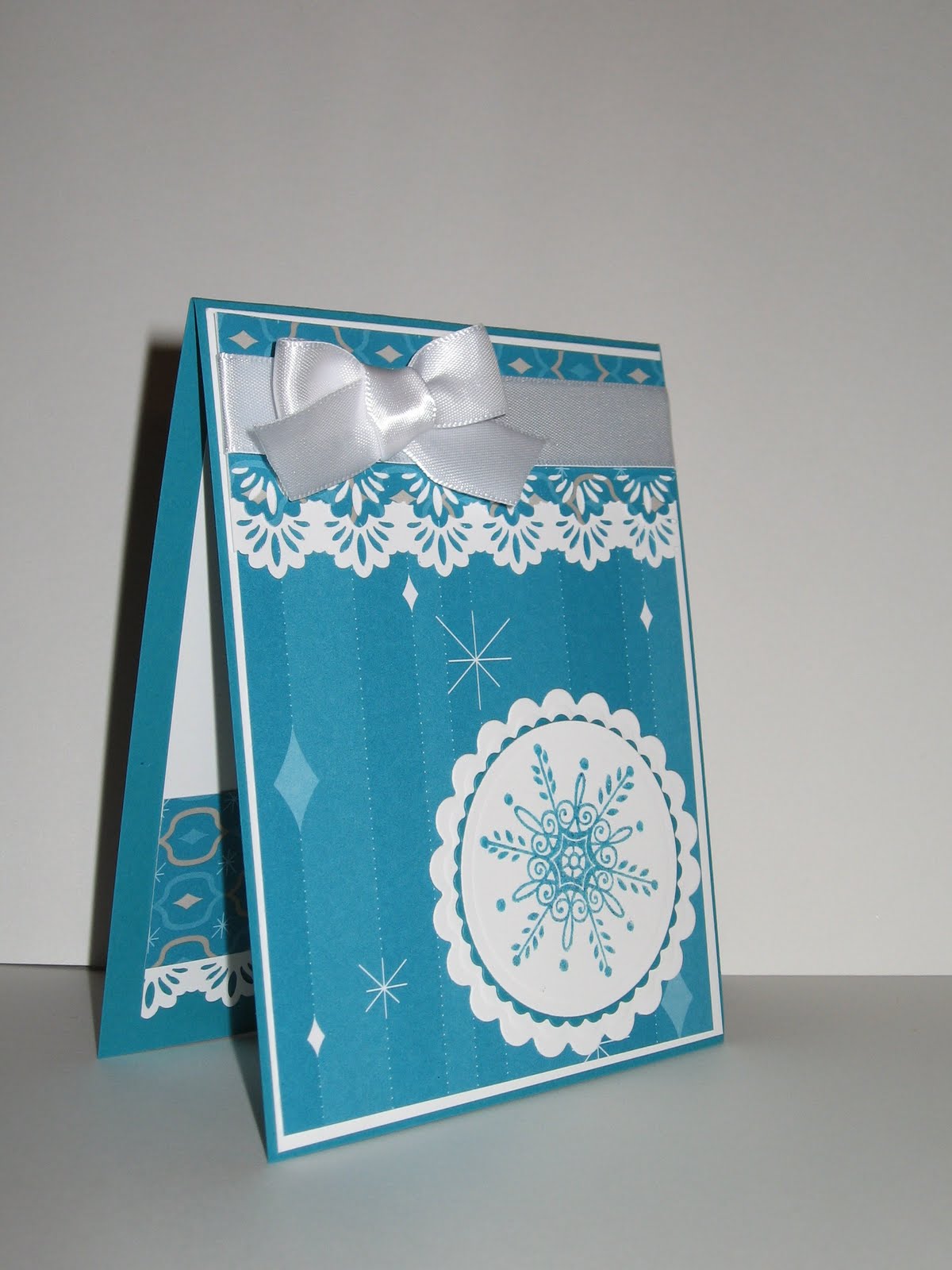 I have to tell you, I only have one more Christmas card to post and that's it for Christmas cards! I will post it tomorrow! My card today is a very simple and quick card. I cased this card from Clean & Simple. Of coarse I changed it up a bit! I stamped serene snowflakes on real red card stock. You can''t see it in the picture but I put silver sticles in the centers and around the edges of the snowflakes. I stamped Merry Christmas from Christmas greetings on the red ribbon with white craft ink. My border is the eyelet border punch from SU. That's it...... pretty simple huh?